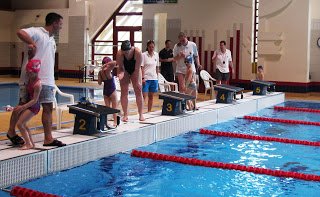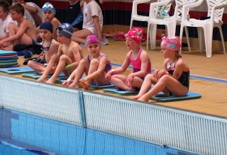 Ábel miután kijárta a vízhezszoktató és a kezdő csoportokat ünnepélyesen átigazolt a félhaladó csoportba. Ez már nem tréfa, a jó meleg 50cm-es kismedencét már csak az óra végi 5 perces játékidőben használhatja. Innentől kezdve ő már a nagy hideg vizes medencében próbálkozik a medence szélén egy vékony sávban.