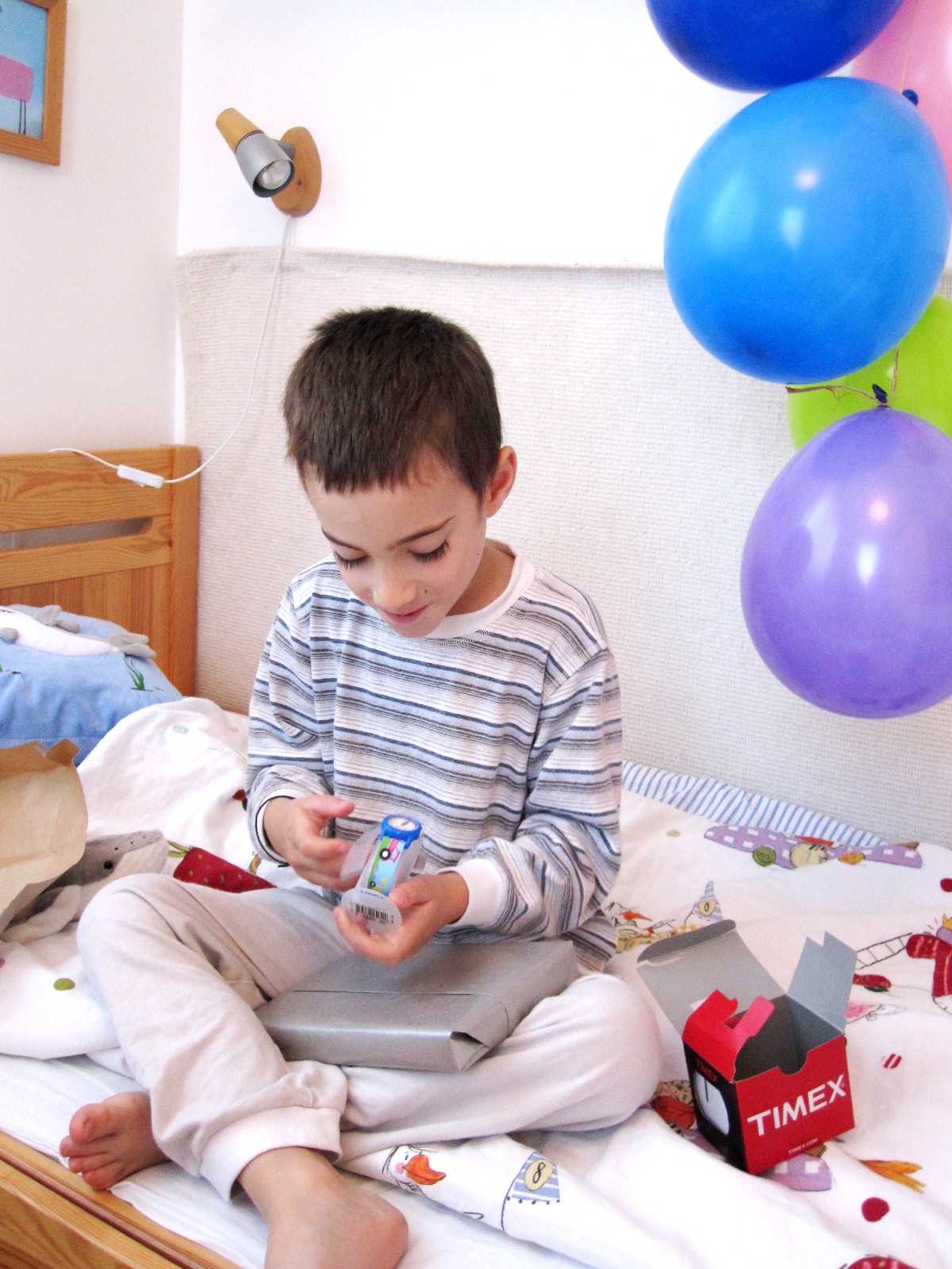 Már reggel ébredés után felköszöntöttük. Volt is nagy boldogság, egy igazi működő karórát, egy kis plüss bálnát és a Rumini és a négy jogar című könyvet kapta tőlünk ajándékba és, hogy ma nem kellett oviba menni, hanem apával és anyával egész nap a mogyoródi aquaparkban vízicsúszdázhatott. Este hétkor már aludt is :-))))