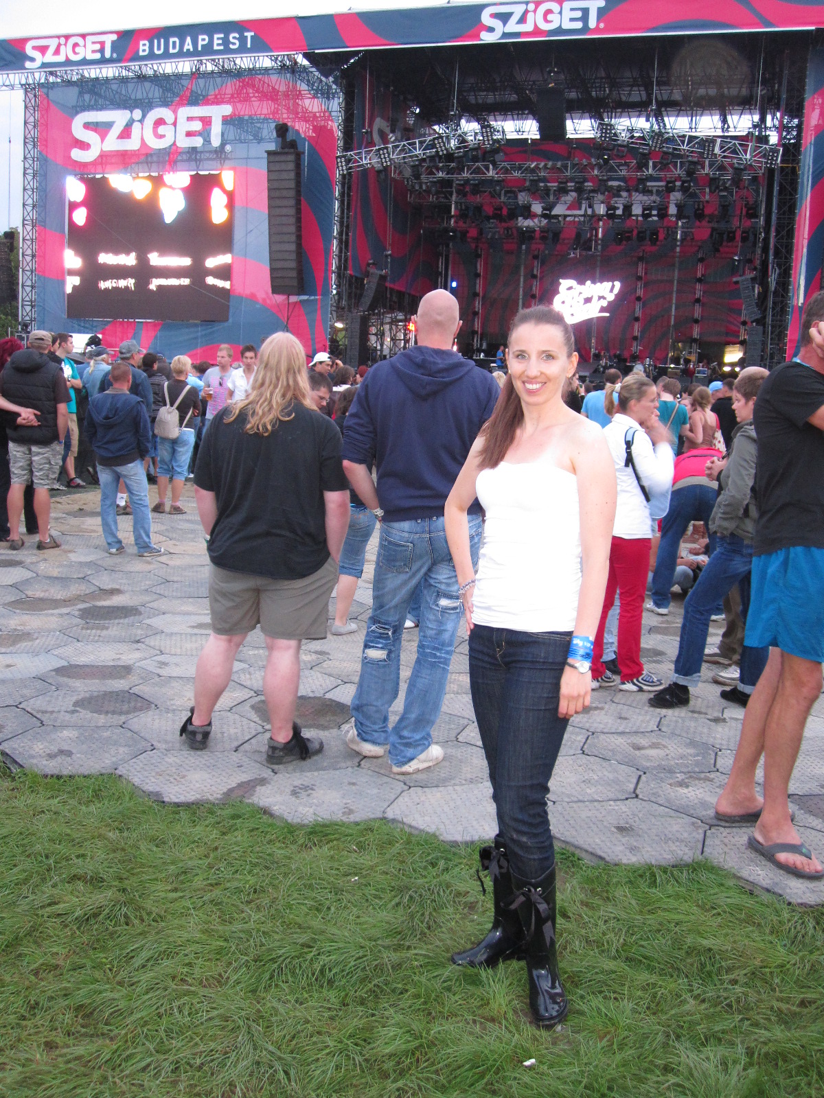 Tegnap Ábel a dédimamánál vakációzott, így mi 10 év után (te jó ég….) kimentünk Mikivel a Szigetre bulizni. A hangulat a régi, a szervezés profi, ToiToi wc-k ugyan úgy büdösek, de mi nagyon jól éreztük magunkat. Igaz otthonról még zuhogó esőben indultunk, de mire odaértünk az ég kitisztult. Csak hogy én egy velúrbőr balerina cipőben érkeztem (anya Martens bakancsa már ki tudja hol van) így a cuppogós sáros bevezető utakon elkezdtem rosszul érezni magam. De mivel a Szigeten most már shopping city is van, elég jó áron megvettem álmaim gumicsizmáját :-). A sár innentől nem jelentett akadályt, sőt! Élveztük a Sziget hangulatot a nagyszínpados Gesztiválig.