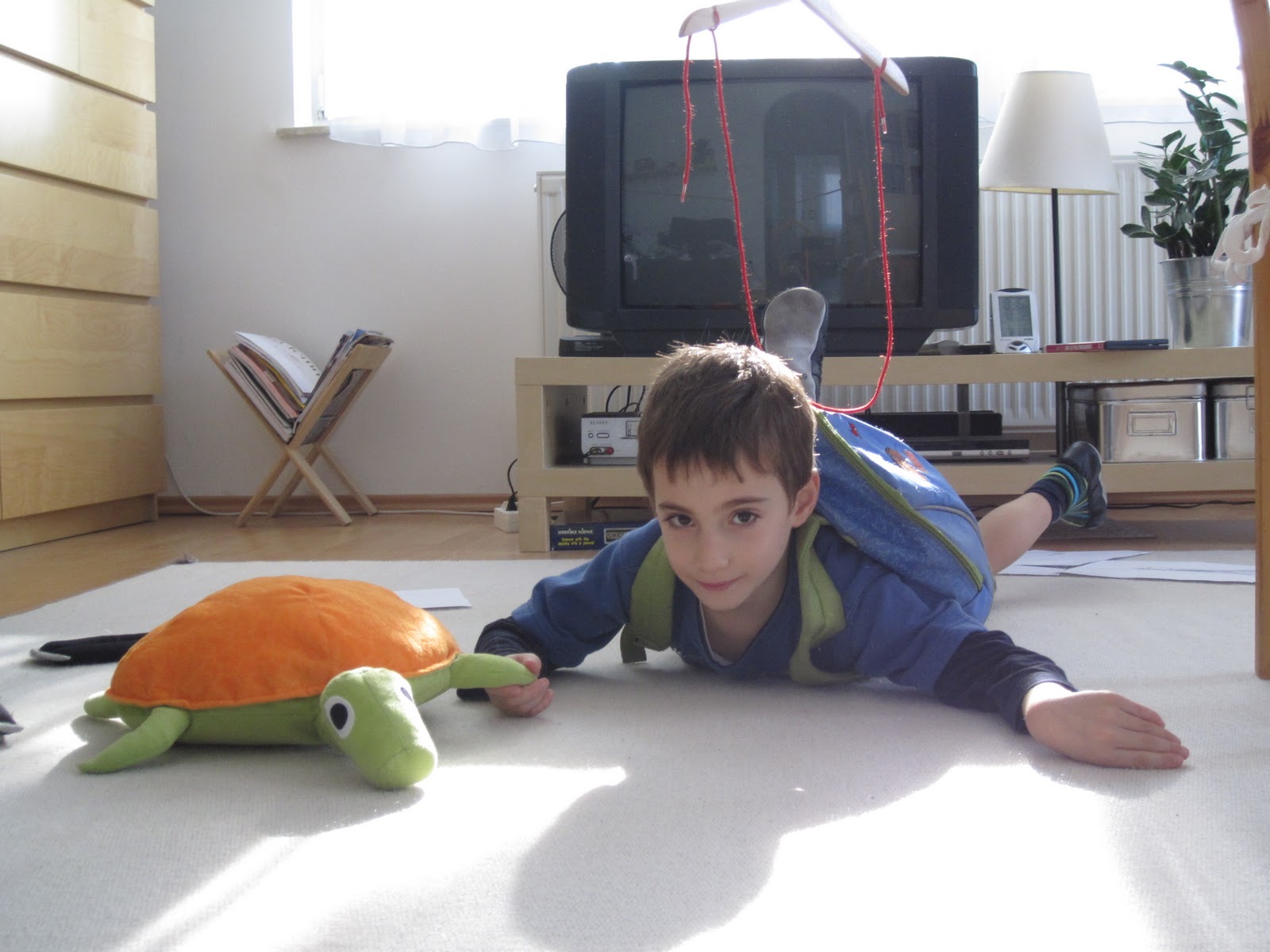 A következő fázisban azonban a piros zsinór már a kis karabineréhez (ezt pár hete vettük ovi után a csavarboltban…) és nadrágja madzagjához lett rögzítve, mint kibiztosítás. A szőnyegen még Ábel saját fejlesztésű, víz alatti motorja látható, amit András kollégámnak tervezett :).