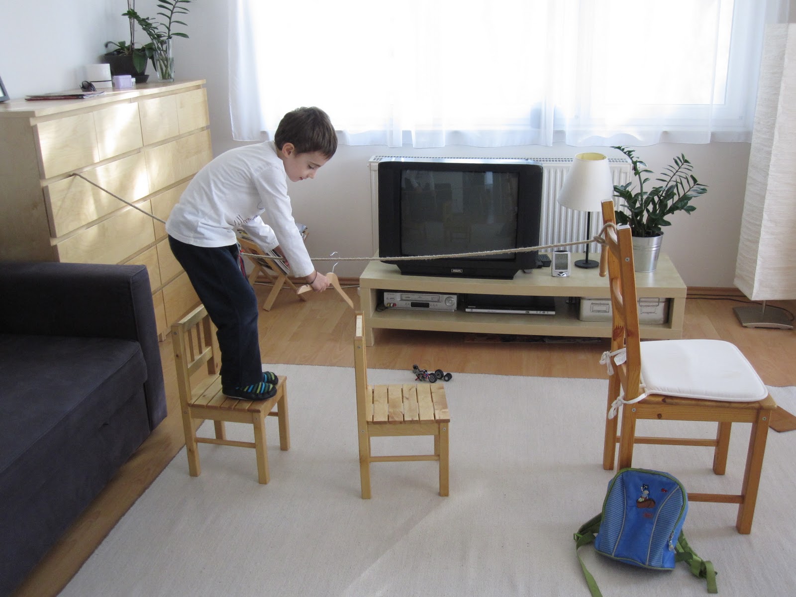 A legózás, várazás, rajzolás még elmegy, de hosszú távon a kalandok, az izgalmak, a különböző szerkezetek és túlélő kalandparkos elemek kifejlesztése a menő játék mostanság. Legalább is nálunk. Míg szombaton apa a hétfői szünetet dolgozta le, anya pedig a konyhában főzőcskézett, addig a gyermek kalandparkot épített a nappaliban.