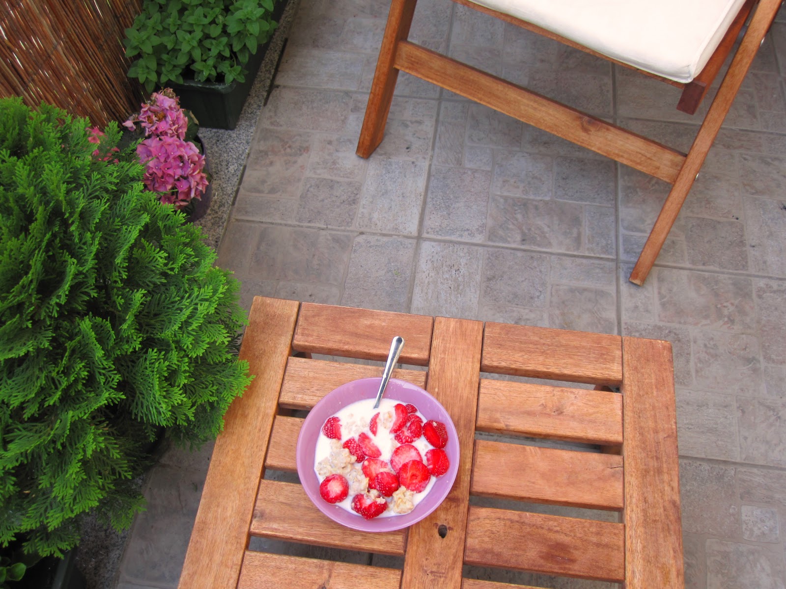 Annyira jó, hogy napsütéses májusi reggel van. Miki száz év után végre eljutott Tomsszal horgászni, Ábel még alszik, én pedig nagyon finom zabpelyhet reggelizem friss eperrel az erkélyen. A nyári virágokat, a levendulát, a hortenziát és a fűszernövényeket még pár hete ültettük Ábellel. Így aztán nagyon kellemes kint üldögélni :)))