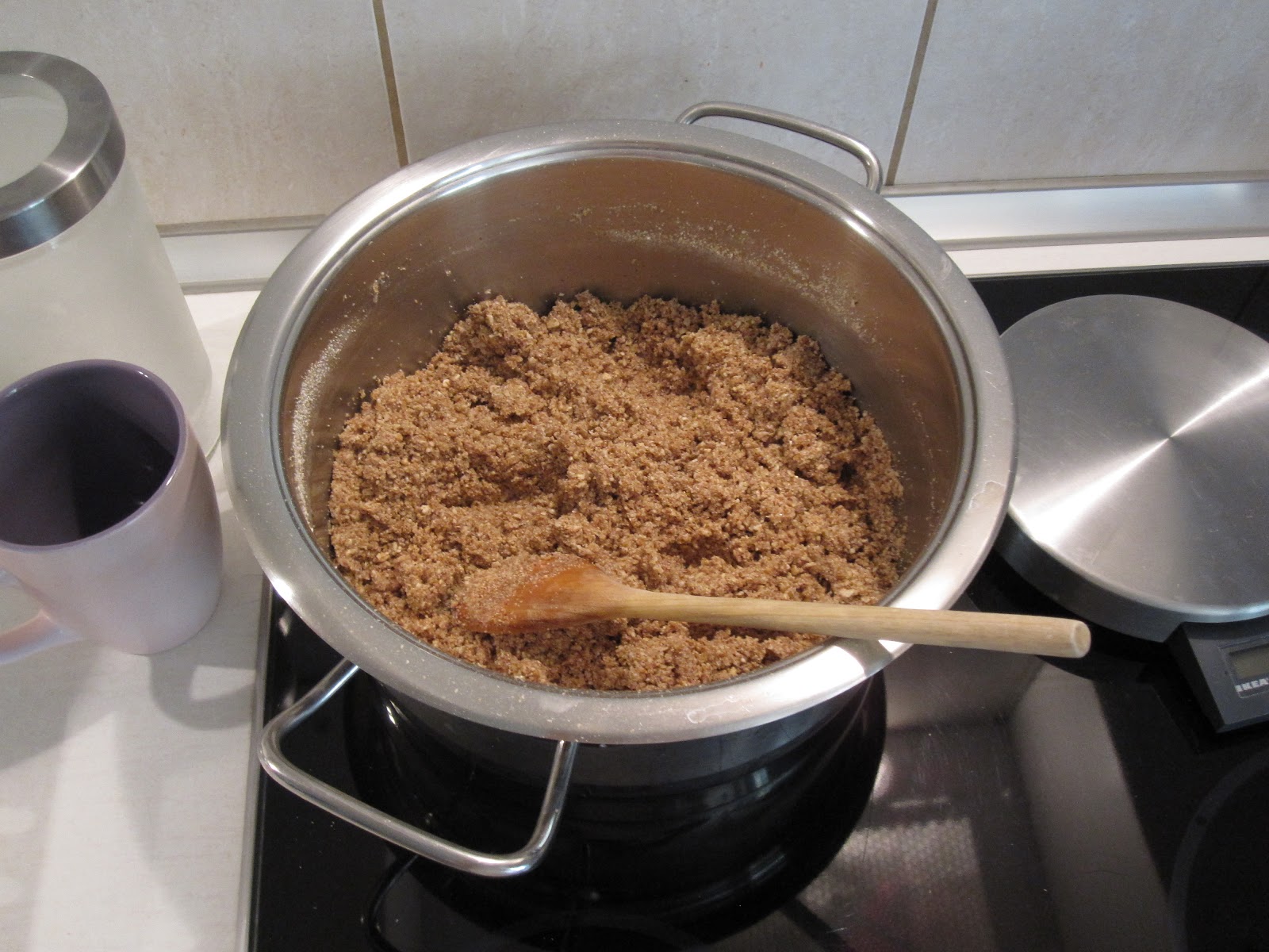 250 gr búza őrölve (én tönkölybúzadarát kaptam a bioboltban), 150 gr árpa őrölve, 100 gr zab őrölve (zabpelyhet és árpapelyhet kaptam, amit botmixerrel könnyedén “megőröltem”), 100 gr kesudió, 150 gr vaj, 150 gr barnacukor (ezt az összetevőt én gyümölcscukorra cseréltem).