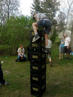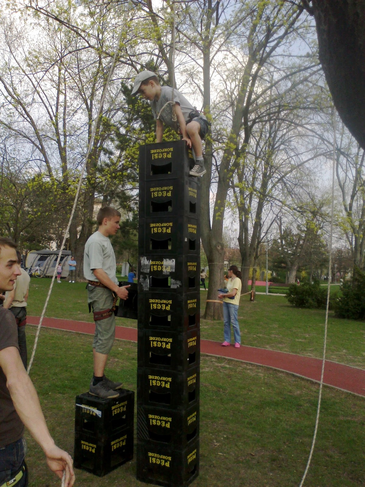 Közhely, de a legjobb játékok, a legolcsóbb tárgyak. Nálunk most éppen a kerületi cserkésznapon Ábel által kipróbált rekeszmászás a kedvenc, amihez 12 sörös rekesz, egy fa, egy kötél (és persze azért egy kis heveder a biztonság kedvéért) kell. A rekeszmászást szervező cserkészfiúk délelőtt tíztől este nyolcig megállás nélkül fogadták a folyamatosan, tömött sorokban várakozó és elszánt érdeklődőket, jócskán lekörözve a többi játékos, kézműves programot.