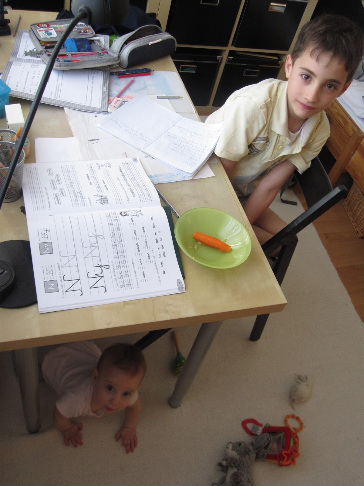 Amúgy közben villám gyorsan mászik és stabilan ül. Kedvelt tartózkodási helye pedig Ábel szobája.